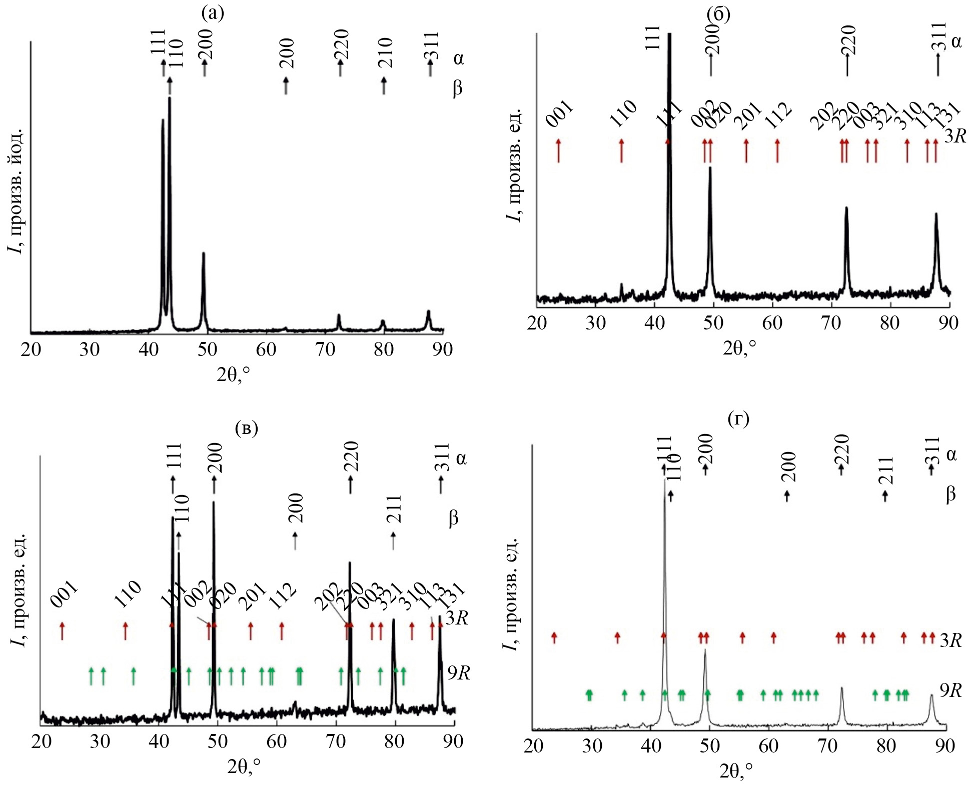 Рис. 1. Рентгеновские дифрактограммы сплава Сu–41%Zn после закалки (а), горячей прокатки с обжатием 90% (б), последующего отжига 120°С, 5 мин (в) или 200°С, 2 ч (г) и соответствующие штрихдиаграммы отражения hkl α(ГЦК), 3R, 9R и β(ОЦК)-фаз.