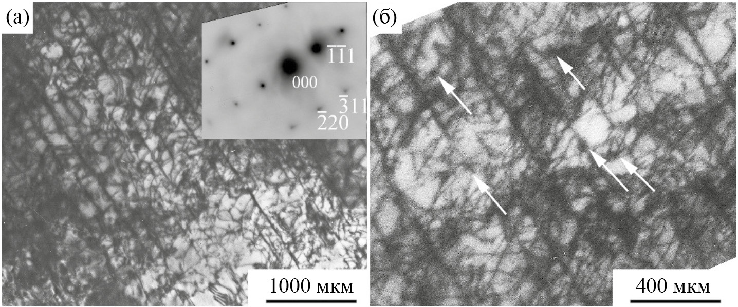 Рис. 5. Светлопольные ПЭМ-изображения (а, б) и соответствующая электронограмма (а – на вставке – ось зоны [112]) α-фазы сплава Cu–41%Zn после горячей прокатки и закалки в воде. Стрелками отмечены β′-частицы β-фазы, обогащенной Zn, на изображениях полос скольжения дислокаций.