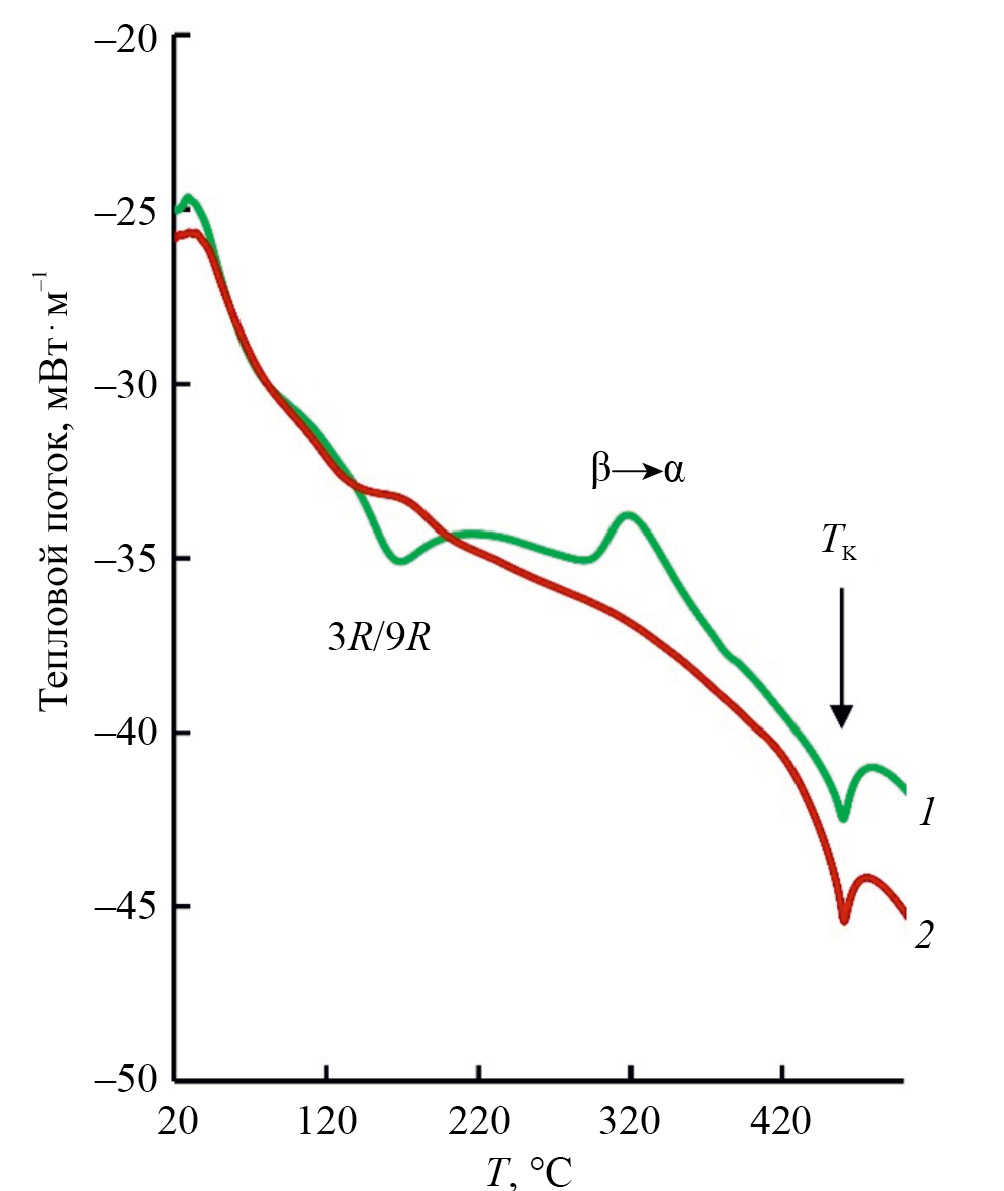 Для более полного понимания механизмов фазовых превращений в сплаве после термической и термомеханической обработок были проведены ДСК-исследования. Во всех случаях наблюдался λ-образный пик при температурах 459–465°С, который соответствует температуре Курнакова (ТК). Для сплава после закалки отчетливо регистрируется эндотермический минимум при температуре, близкой 170°С, который, по-видимому, связан с началом появления в сплаве бейнита с чередующейся структурой 3R/9R (рис. 6, кривая 1). При увеличении температуры выше 310°С выявлен экзотермический пик при 330°С, который связан с завершением процесса рекристаллизации α-ГЦК-фазы после выделения 3R/9R бейнита. Тепловые эффекты на кривых ДСК-сплава после горячей прокатки более размыты и слабее (рис. 6, кривая 2).