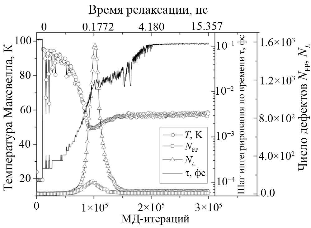 Размер моделируемого кристалла Nbox выбирали в зависимости от энергии EPKA, из расчета эВ/ат (см. табл. 1), так, чтобы смещенные атомы не выходили за его пределы. Параметр решетки неупорядоченного твердого раствора определили из условия нулевых действующих внутренних напряжений. Перед введением ПВА моделируемый кристалл привели в состояние термодинамического равновесия в течение 1.0×104 итераций, см. рис. 1. Температуру кристалла в процессе релаксации атомных смещений, инициированных ПВА, не контролировали. После релаксации атомных смещений нагрев кристалла, вызванный введением ПВА, не превышал ≈ 40° ни в одном из компьютерных экспериментов.