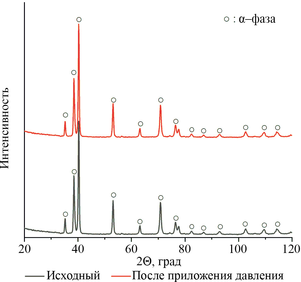 По результатам РСА сплава ВТ1-0 после приложения давления и выдержки под ним без кручения было установлено, что структура полностью состоит из α-Ti. Этот спектр совпадает со спектром образца в исходном состоянии. Оба спектра приведены на рис. 1.