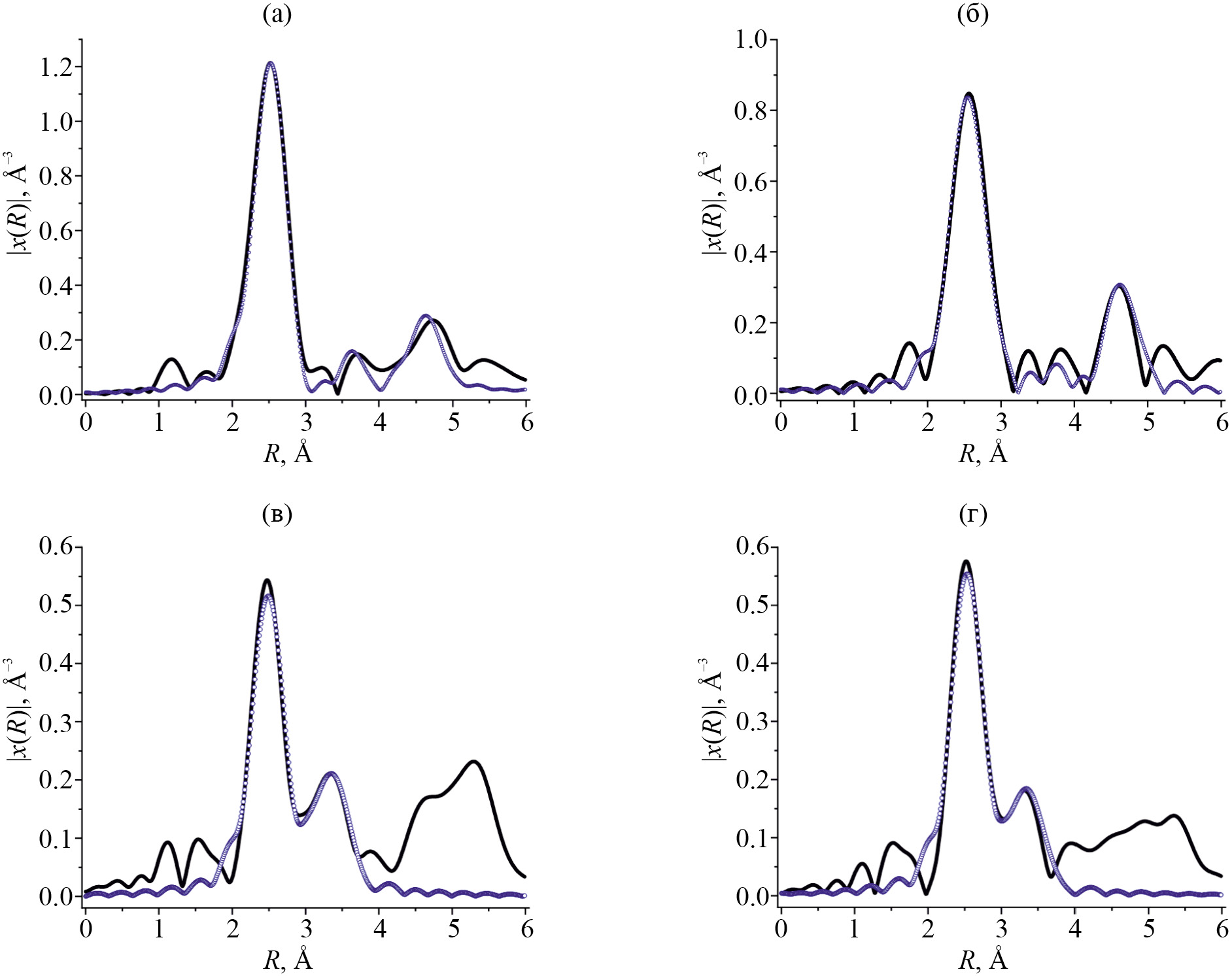 Рис. 3. Сравнение экспериментального (прозрачные синие точки) и расчетного спектров EXAFS (сплошные линии) в R-пространстве для образца ВТ1-0 в исходном состоянии (а), после приложения давления 6 ГПа с выдержкой 10 минут (б), после КВД на 1 оборот (в), после КВД на 4 оборота (г).