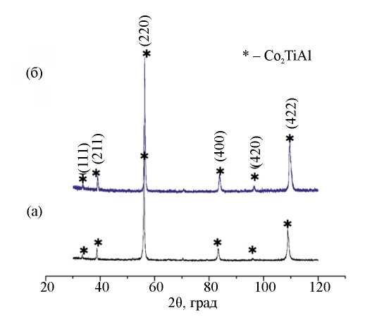 Рентгенофазовый анализ синтезированных образцов показал, что в обоих случаях (для смесей I и II) основной фазой является Co2TiAl с характерной для сплавов Гейслера структурой L21, массовое содержание которой составило не менее 99 % (рис. 2). Фаза Co2TiAl кристаллизуется в кубической пространственной группе симметрии Fm3m, где Ti связан в объемно-центрированной кубической геометрии с восемью эквивалентными атомами Co. Каждый атом Co связан в объемно-центрированной кубической геометрии с четырьмя эквивалентными атомами Ti и четырьмя эквивалентными атомами Al [22].