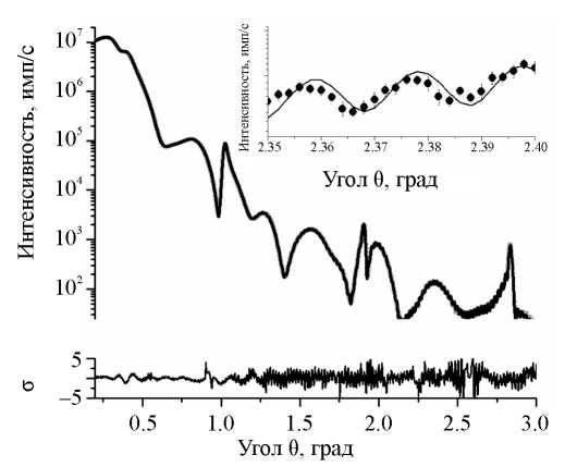 Рис. 1. Теоретические (сплошные) и экспериментальные (точки) кривые рефлектометрии для образца А и кривая невязок σ. На вставке представлен фрагмент кривой в диапазоне 2.35–2.40 град.