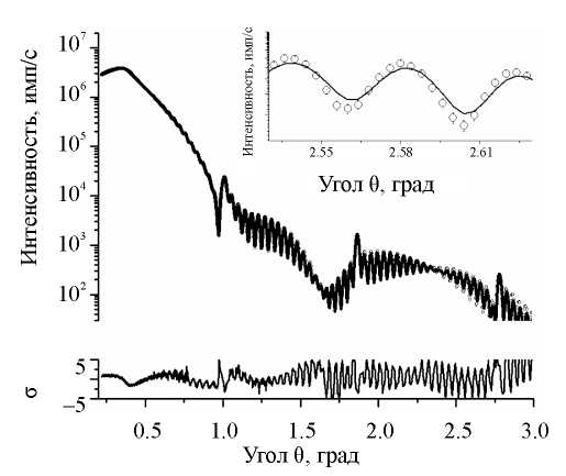 Рис. 2. Теоретические (сплошные) и экспериментальные (точки) кривые рефлектометрии для образца Б и кривая невязок σ. На вставке представлен фрагмент кривой в диапазоне 2.51–2.64 град.
