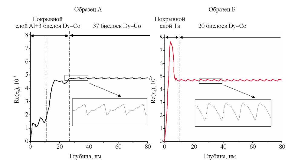 При анализе рефлектограммы от кривой рентгеновской рефлектометрии образца А не удалось получить хорошего согласия с экспериментальными данными, используя модель с номинальными толщинами слоев Dy и Co. Известно, что слой алюминия толщиной 10 нм может не полностью защищать периодическую систему от проникновения атмосферного кислорода [14], что приводит к окислению редкоземельного металла. Поэтому модель была усложнена: распределение поляризуемости последних 3 бислоев перед защитным слоем варьировали отдельно от основной периодической системы. Использование такой модели позволило получить хорошее согласие теоретических и экспериментальных кривых. В результате процедуры подгонки было получено распределение поляризуемости по глубине (рис. 3).