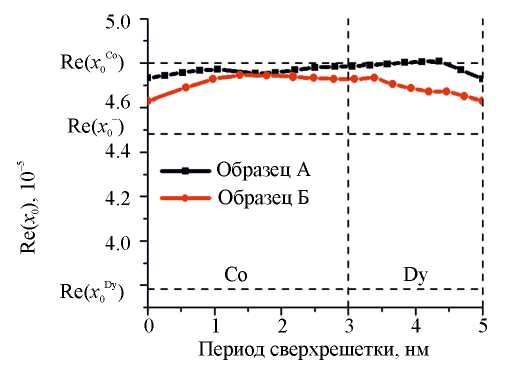 Для системы Dy 2 нм/Co 3 нм среднее значение поляризуемости [12] находится близко к χ0=4.477‧10−5. Профили распределения поляризуемости одного периода для образцов А и Б представлены на рис. 4. Видно, что полученные профили поляризуемости для обоих образцов находятся выше линии среднего значения поляризуемости χ0, при этом распределение поляризуемости в периоде для образца А отличается от образца Б.