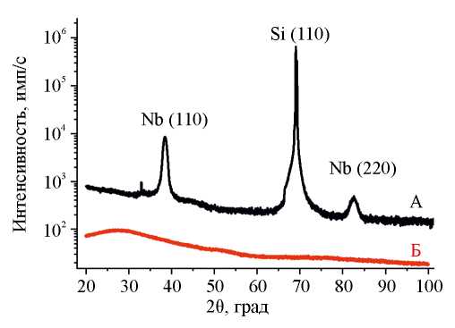 Исследования показали (рис. 5), что при θ-2θ-съемке на КДО для образца А наблюдаются пики от Nb и Si, что указывает на кристаллическое состояние буфера и подложки. В то же время КДО для образца Б не содержит дифракционных пиков, не только от подложки, но и буферного слоя Ta. Согласно [16, 17], при напылении тонкого (до 2 нм) слоя Ta на некристаллическую подложку формируется аморфный слой Ta, при увеличении толщины слоя Ta выше 2 нм – тетрагональная кристаллическая решетка β-фазы Ta. В соответствии с этим, можно предположить, что в слое Ta существует переход от аморфного к нанокристаллическому β-Ta-состоянию. Дифракционных пиков от возможных структурных фазообразований в МПС, измеренных в стандартной геометрии на КДО для обоих образцов не наблюдается, вероятно, из-за их малых толщин слоев.