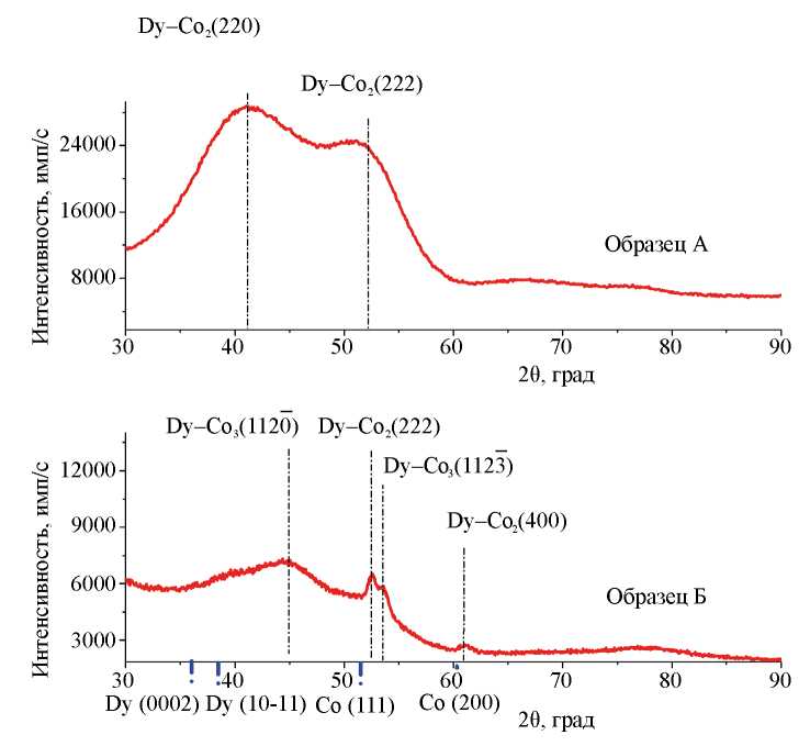 Рентгенофазовый анализ данных дифракции при фиксированном угле скольжения рентгеновского излучения на исследуемые образцы ω=1° (рис. 6) подтвердил наличие фазы с кубической решеткой DyCo2 в образцах А и Б. Наиболее ярко выражены дифракционные пики DyCo2 (220) и (222). Для образца Б на КДО наблюдаются дифракционные пики, которые могут быть идентифицированы как дифракционные отражения от DyCo2 и DyCo3. Наличие гексагональной фазы DyCo3 подтверждается отражениями (11–20) и (11–23). Интенсивность пиков от DyCo2 в образце Б значительно меньше, чем в образце А, что может указывать на то, что интерметаллид находится в нанокристаллическом состоянии. Линии DyCo3 также являются слабоинтенсивными. Фазообразование интерметаллидов DyCo2 и DyCo3 согласуется с фазовой диаграммой Dy–Co [15].