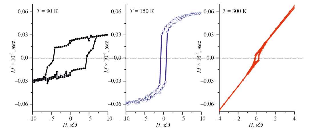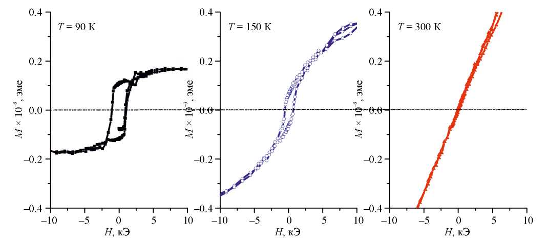 Образцы А и Б имеют разные магнитные свойства. На СКВИД магнетометре были измерены петли гистерезиса с максимальным внешним полем ±15 кЭ в диапазоне температур 90–300 К. Магнитный момент M измеряли в магнитном поле, направленном перпендикулярно плоскости образцов. Поскольку исходные данные содержат информацию не только от пленки, но и от подложки, для выделения информации о пленке дополнительно измеряли зависимости M(H) для чистой подложки, которые затем вычитали из исходных данных.