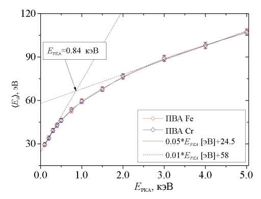 Плавный переход от образования изолированных точечных дефектов к дефектообразованию в каскадах смещений происходит в интервале энергий ПВА Оценочное значение минимальной энергии ПВА необходимой для образования каскада смещений в бинарном неупорядоченном твердом растворе Fe–10 ат.%Cr, определили по пересечению асимптот зависимости при больших и малых значениях .