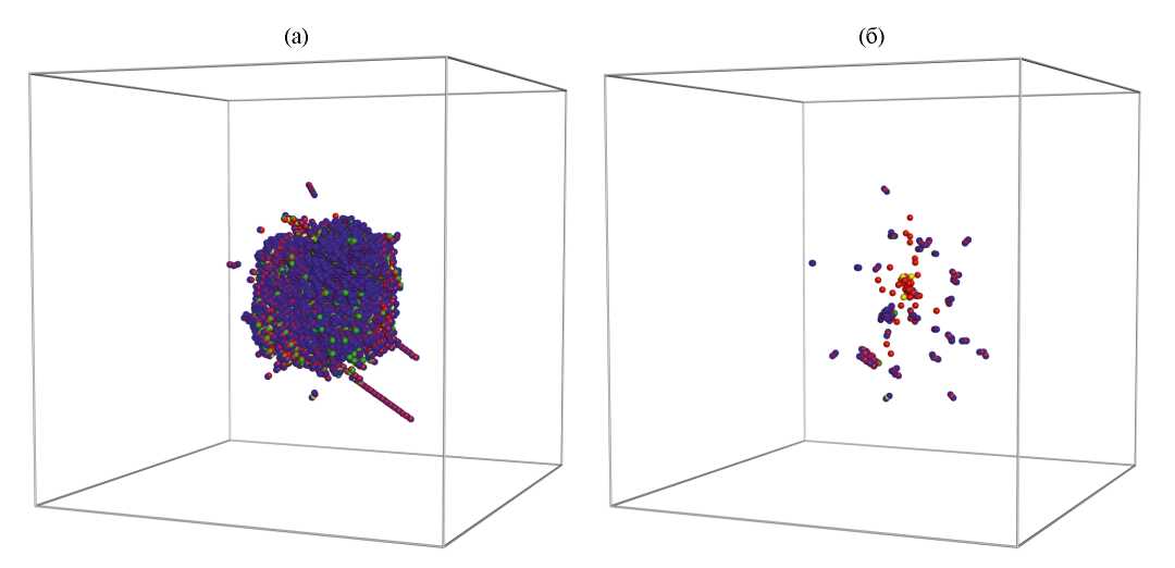 Успешные исследования первичного дефектообразования методом МД проводятся на протяжении нескольких десятилетий [44–48]. За это время изучены фундаментальные закономерности образования радиационных дефектов в чистых металлах и сплавах, полупроводниках, керамических материалах, полимерах и т.п. МД позволяет проанализировать влияние температуры и действующих напряжений на образование и кластеризацию радиационных дефектов, разупорядочение и аморфизацию под облучением, взаимодействие дефектов со свободной поверхностью облучаемой мишени, границами раздела фаз и вакансионными порами, дислокациями, границами зерен, атомами примесей и т.д. [48].