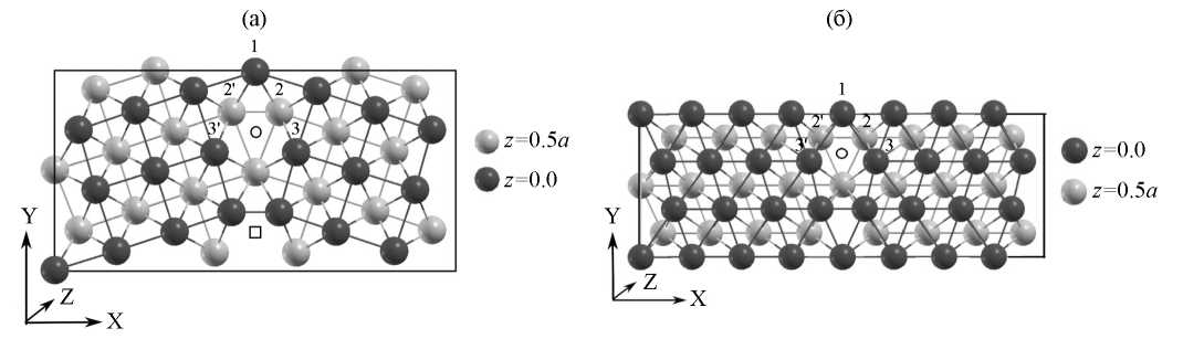 На рис. 1а можно выделить структурный элемент границы для ГЗ Σ5(310), образованный двумя тройками атомов, лежащих в плоскости z=0.5a и z=0. Наиболее стабильной позицией сегрегации для примесей внедрения (например, атома углерода), обладающей наибольшим объемом многогранника Вороного, оказался (как и в работе [34]) центр этого структурного элемента, обозначенный на рисунке 1 небольшим черным кружком. Как выяснилось в настоящем исследовании, предпочтительные межузельные позиции атомов примеси для границы Σ3(111) располагаются аналогично, как показано на рис. 1б. Атомы железа, окружающие указанные центры внедрения, обозначенные 1, 2, 3, 2ʹ, 3ʹ, представляют позиции, куда в данном исследовании помещались примеси замещения. Рост номера позиции соответствует удалению от плоскости границы. Заметим, что примеси помещаются только на одну из границ, входящих в суперячейку, при этом наличие второй границы во всех приведенных ниже расчетных формулах компенсируется, поскольку они содержат разность энергий допированной и недопированной суперячейки.