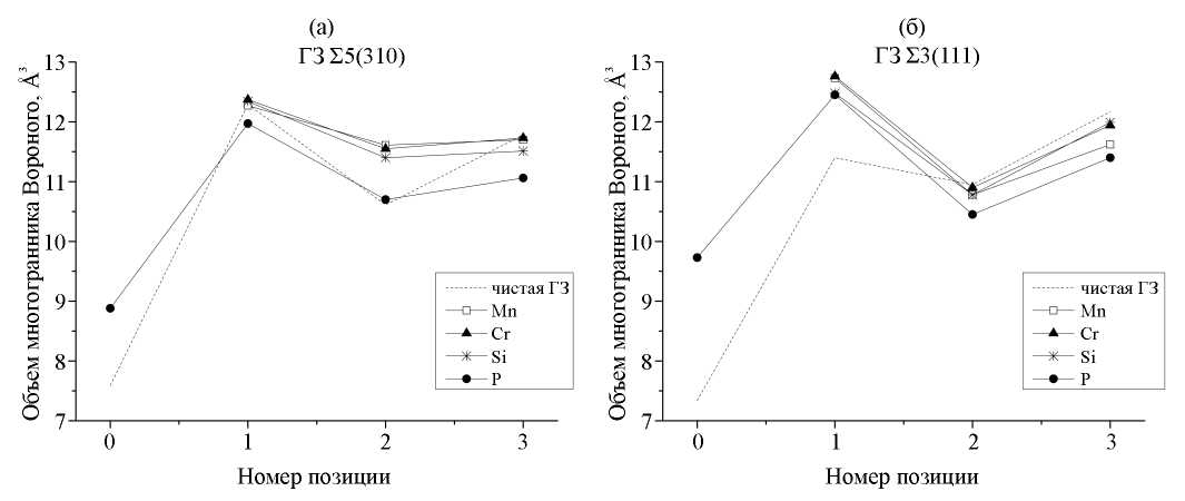 Отметим, что структуры границ значительно отличаются, поэтому объем многогранника Вороного для атома Р в позиции замещения 2 на границе Σ3(111) составляет всего 10.45 Å3, вместо 10.70 Å3 для границы Σ5(310). Также, как и на границе Σ5(310), при замещении одного из ближайших атомов Fe примесями Mn и Cr объем многогранника атома Р слабо меняется. Более значимое увеличение объема производят примеси Si и P при замещении позиций 2ʹ и 3. Отметим также, что помещение атома Si или второго атома P в позицию 1 уменьшает свободный объем примеси замещения Р, тогда как в случае границы Σ5(310), наоборот, происходило его увеличение.