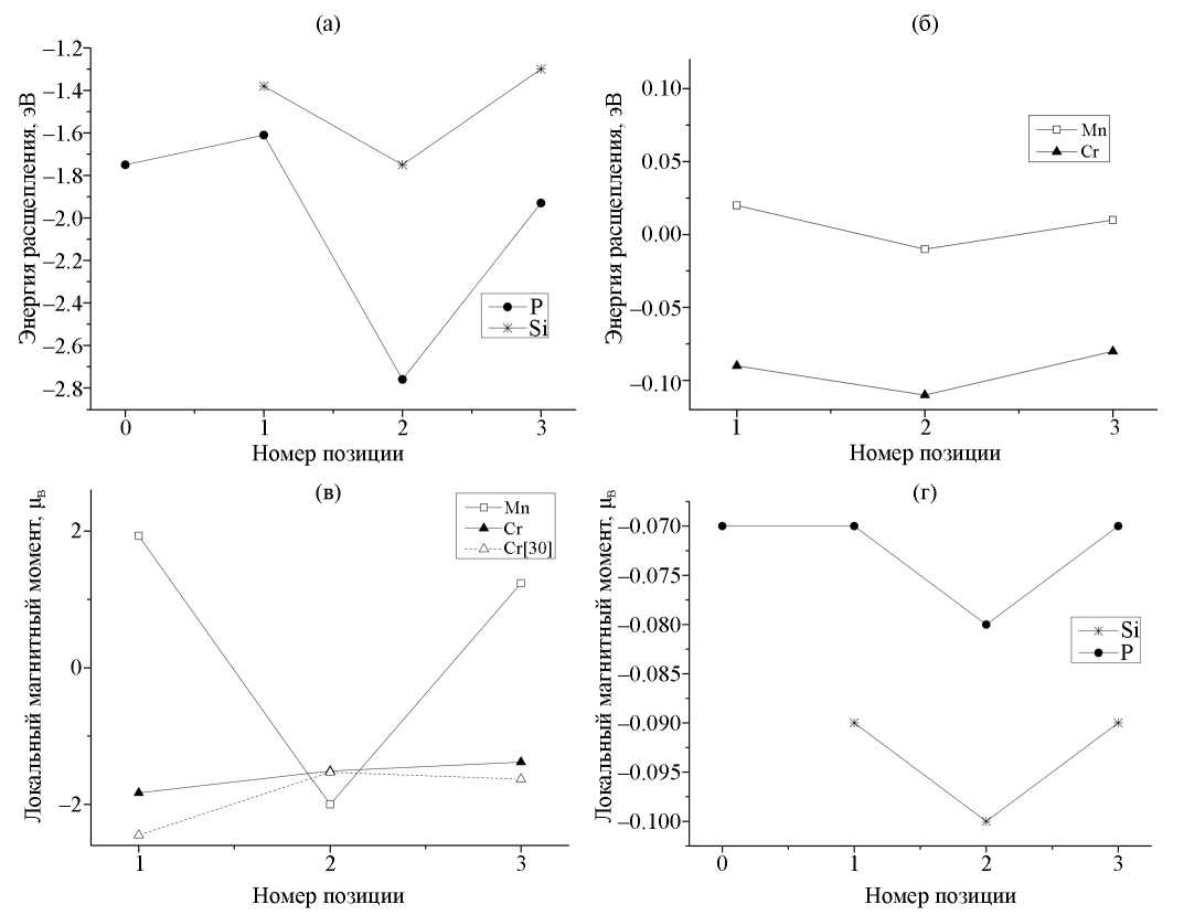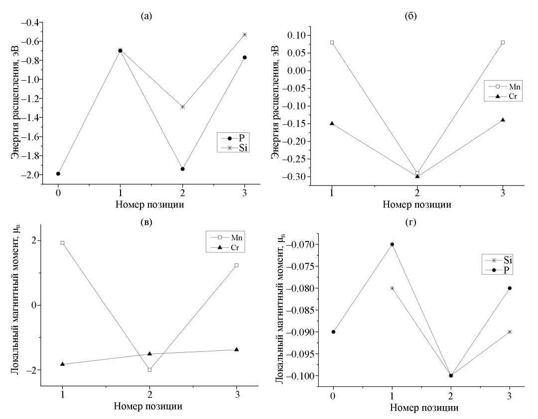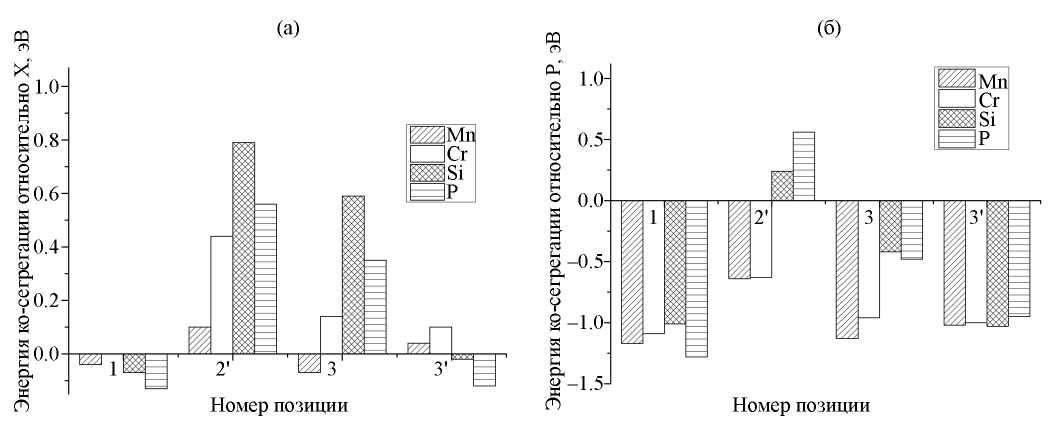 Из рисунка 6а видно, что при нахождении атома фосфора в позиции замещения, наименьшей энергией обладают конфигурации, в которых атомы Si, P, Mn находится в 1 позиции, а атом Cr – в позиции 3ʹ. Заметим, что в случае одиночного расположения этих примесей на ГЗ более предпочтительной (меньшая энергия сегрегации) являлась позиция 2 (рис. 2, табл. 1)). Причина изменения предпочтительной позиции растворения связана с взаимодействием между примесями. При расположении фосфора в узле внедрения (позиция 0) для всех примесей, кроме хрома, наименьшую энергию продолжает обеспечивать позиция 2 (рис. 6б). Для атома Cr более предпочтительной оказывается позиция 1, как показал наш расчет, благодаря понижению энергии на –0.11 эВ в данной позиции из-за взаимодействия с атомом P. Данные рисунка показывают, что сегрегированные атомы фосфора на границе зерна располагаются парами на близких расстояниях друг от друга в позициях 0–2 или 1–2.