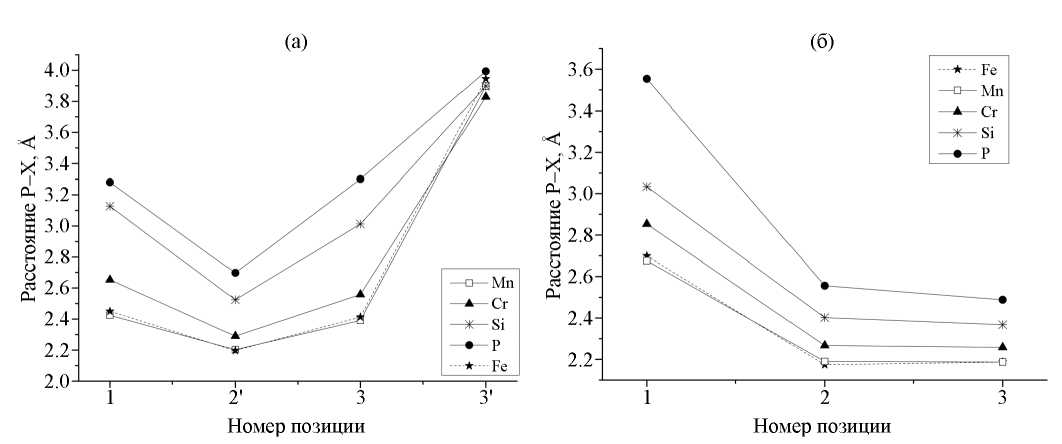 Взаимное отталкивание между атомом фосфора и примесями Si, P, Cr еще более отчетливо видно на рис. 5, где представлена зависимость расстояния от атома фосфора (во 2 позиции (а), в 0 позиции (б)) до соответствующей примеси от номера позиции замещения. Видно, что такое отталкивание характерно для атома Р как в позиции внедрения, так и замещения. Наиболее сильно отталкивание для пар P–P и P–Si, значительно слабее для пары P–Cr, и практически отсутствует для пары P–Mn.