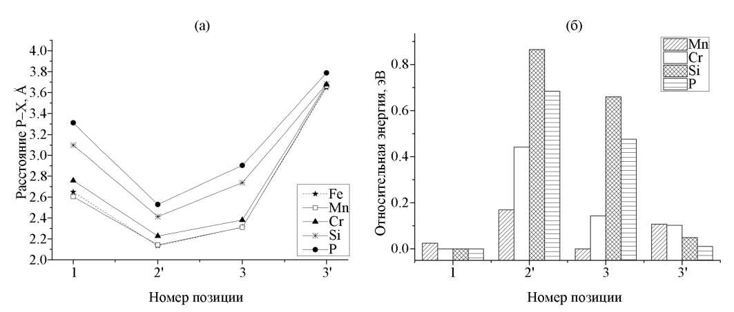 Как видно из данных рис. 10а, при замещении атомов железа примесями (Х=Mn, Cr, Si) в позициях 1, 2ʹ, 3, 3ʹ происходит возрастание расстояний между примесью фосфора в позиции замещения 2 и указанными узлами. Это свидетельствует об отталкивании между примесями Р–Х, которое невелико для примесей Mn и Cr, но весьма значительно для примесей Si, и особенно сильно для второй примеси замещения P. Заметим, что указанная зависимость достаточно близка к своему аналогу для границы Σ5(310) (рис. 5). Из рис. 10б видно, что наименьшей энергией системы обладают системы P–X, когда Х находится в 1 позиции. Для марганца наиболее выгодно положение по одну сторону ГЗ с фосфором.