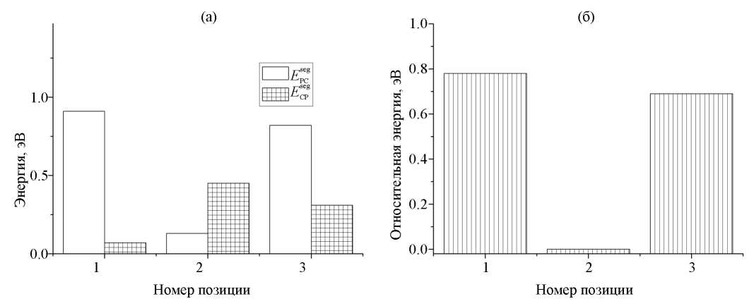 Рис. 12. Энергии ко-сегрегации фосфора с углеродом и в зависимости от номера позиции фосфора на межзеренной границе Σ3(111) (а). Углерод занимает позицию внедрения (0). Зависимость относительной энергии границы зерна с атомом углерода (0) и фосфором от номера позиции Р (б).