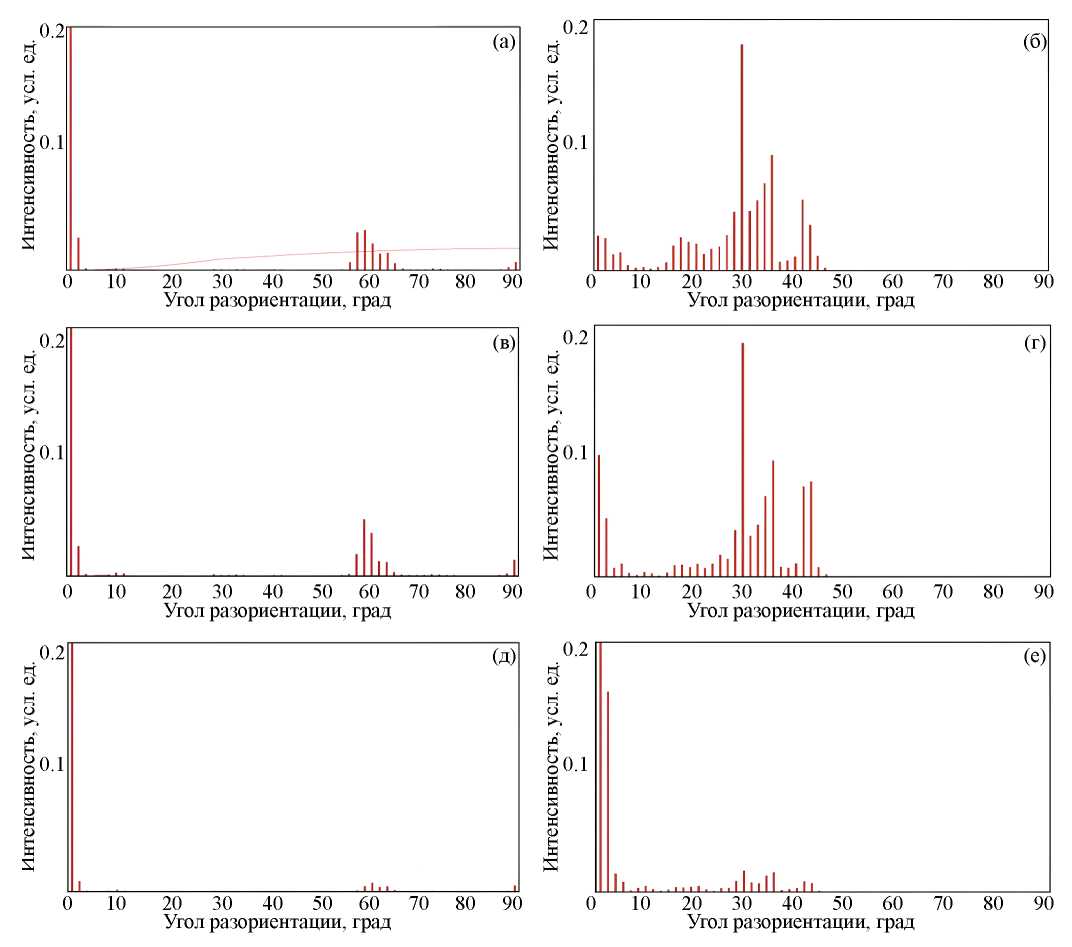 Для всех образцов наблюдаются качественно схожие спектры угловых отклонений межфазных границ β/α'(α) от “бюргерсовских” разориентаций (рис. 4). Во всех спектрах наблюдаются пики на углах 0°, ~30°, ~35°, ~42°. Пик на 42° соответствует ситуации, когда ориентации соседствующих кристаллитов α′(α)- и β-фаз в углах Эйлера практически совпадают. Данная ситуация, по всей видимости, является ошибочной, возникающей при использовании преобразования Хафа. В случае ошибочной идентификации фазы α'(α) вместо β или наоборот между кристаллитами α'(α)- и β-фаз должны возникать отклонения от точного ОС на углы ~45°, соответствующие минимальным разориентациям описываемым ОС. В работе [54] показаны подобные ошибочные случаи определения отдельных выделений фаз и их ориентаций при проведении методом EBSD γ/α-фазового анализа в сталях.