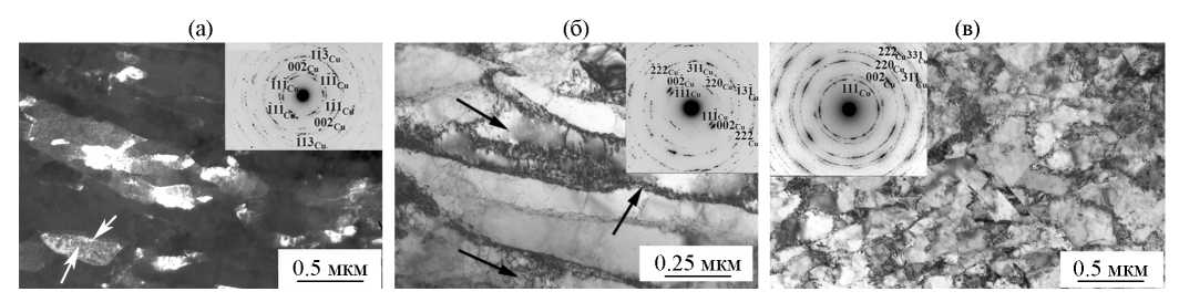 Последующие отжиги по-разному влияют на изменение СМК-структуры исследованных сплавов. Так, отжиг двойного и тройных СМК-сплавов, легированных Zr, при температурах 200–350°С не приводит к изменению структуры. Повышение температуры отжига до 350–400°С (для сплавов Cu–Cr–Zr) и до 400–450°С (для сплава Cu–Zr) вызывает дополнительный распад пересыщенного α-твердого раствора меди с выделением частиц Cu5Zr размерами 5–10 нм. На электронограммах (рис. 2а, б) присутствуют рефлексы фазы Cu5Zr. Гетерогенное выделение частиц на границах субзерен и на дислокациях показаны стрелками на рис. 2а, б. Вокруг гетерогенно выделившихся частиц Cu5Zr зачастую наблюдали деформационный контраст, указывающий на существование когерентной (или частично когерентной) связи между решетками [22–25]. Частицы Cu5Zr, выделяясь на дислокациях на границах и внутри зерен-субзерен, способствуют закреплению и уменьшению подвижности дислокаций в результате чего замедляется процесс образования центров рекристаллизации, требующий перестройки дислокационной структуры.
