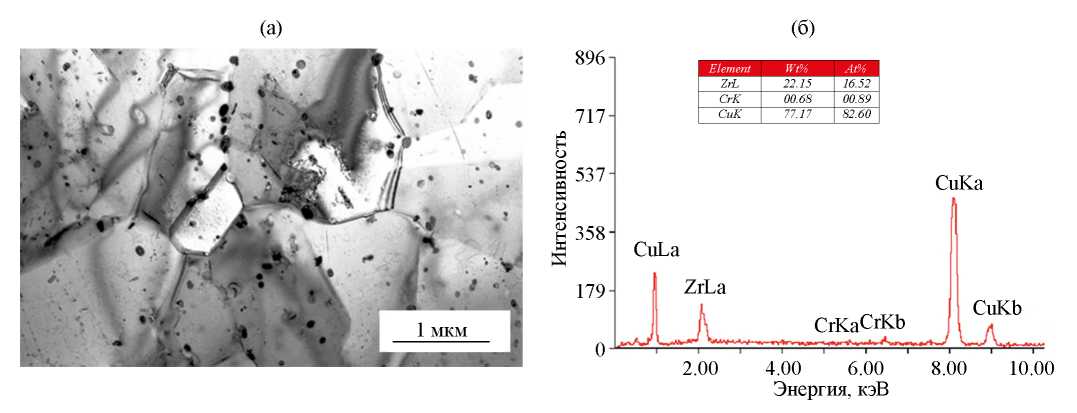 Рис. 3. Микроструктура сплава Cu–0.21%Cr–0.20%Zr после ДКУП и отжига при 700°С, 1 ч (а) и микрорентгеноспектральный анализ глобулярной частицы Cu5Zr (б).