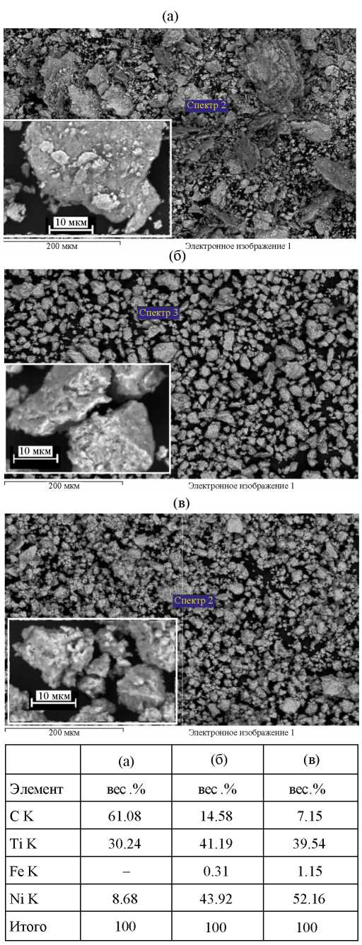 Рис. 3. СЭМ-изображения и результаты МРСА частиц смеси 50(Ti+C) + 50Ni (вес.%) после МА в течение: (а) 40 с, (б) 2 мин и (в) 4 мин.