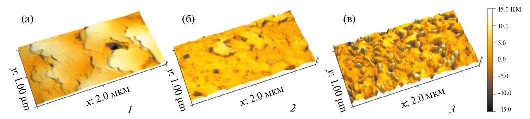 На АСМ-изображениях (рис. 3) можно заметить значительное различие морфологии поверхности образцов. Латеральный размер неоднородностей рельефа, то есть корреляционная длина (B), у образца 1 примерно в два раза больше, чем у образца 2. В образце 3 размер B близок к таковому у образца 2, а также наблюдается появление более мелких неоднородностей в рельефе. Средняя шероховатость у образца 3 Ra(3) = 2.4 нм практически в два раза выше, чем у образца 2 Ra(2) = 1.2 нм.