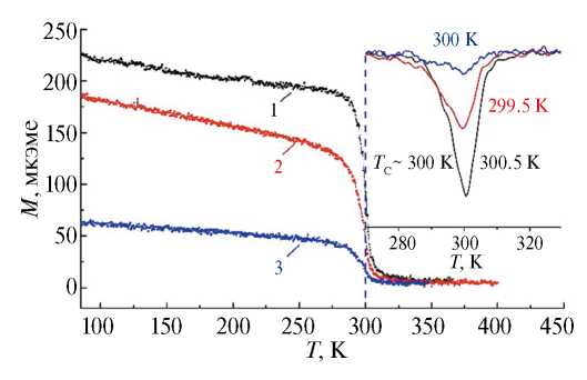 Рис. 5. Температурные зависимости намагниченности M(T) в поле 100 Э для трех образцов. На вставке показаны производные dM/dT.