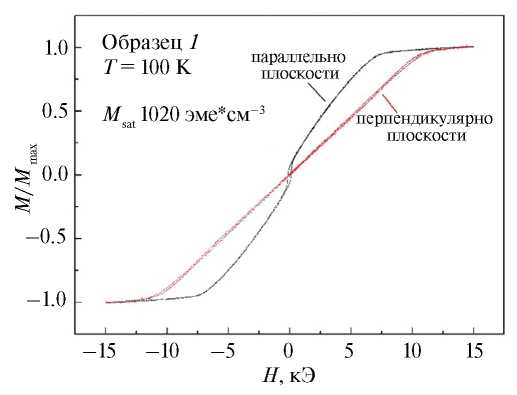 Рис. 6. Полевые зависимости намагниченности M(H) образца 1 при температуре 100 K в магнитном поле, параллельном и перпендикулярном плоскости пленки.