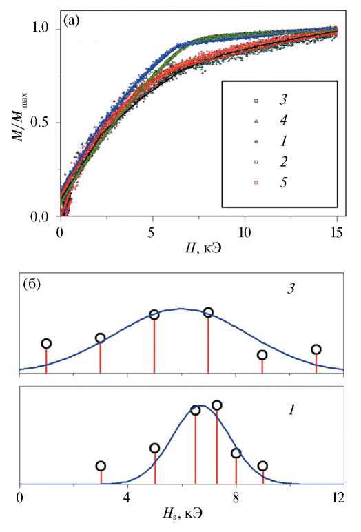 Рис. 7. Кривые намагничивания пленок и их описание (сплошные линии) выражением (2) — а; неоднородность поля Hs, определенная с помощью описания кривых намагничивания выражением (2), на примере образцов 3 и 1 (высота столбца соответствует статистическому весу fi участка пленки, характеризующегося полем HSi) — б.