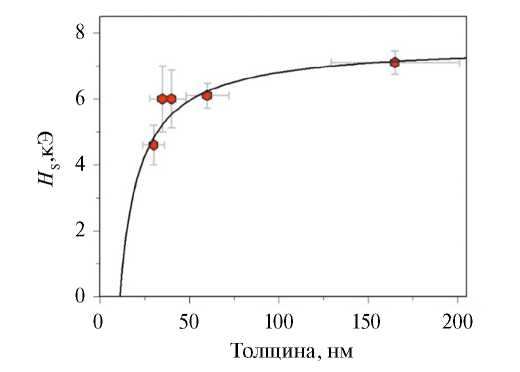 Рис. 8. Поле насыщения HS для пленок различных толщин. Сплошная линия — уравнение (1).