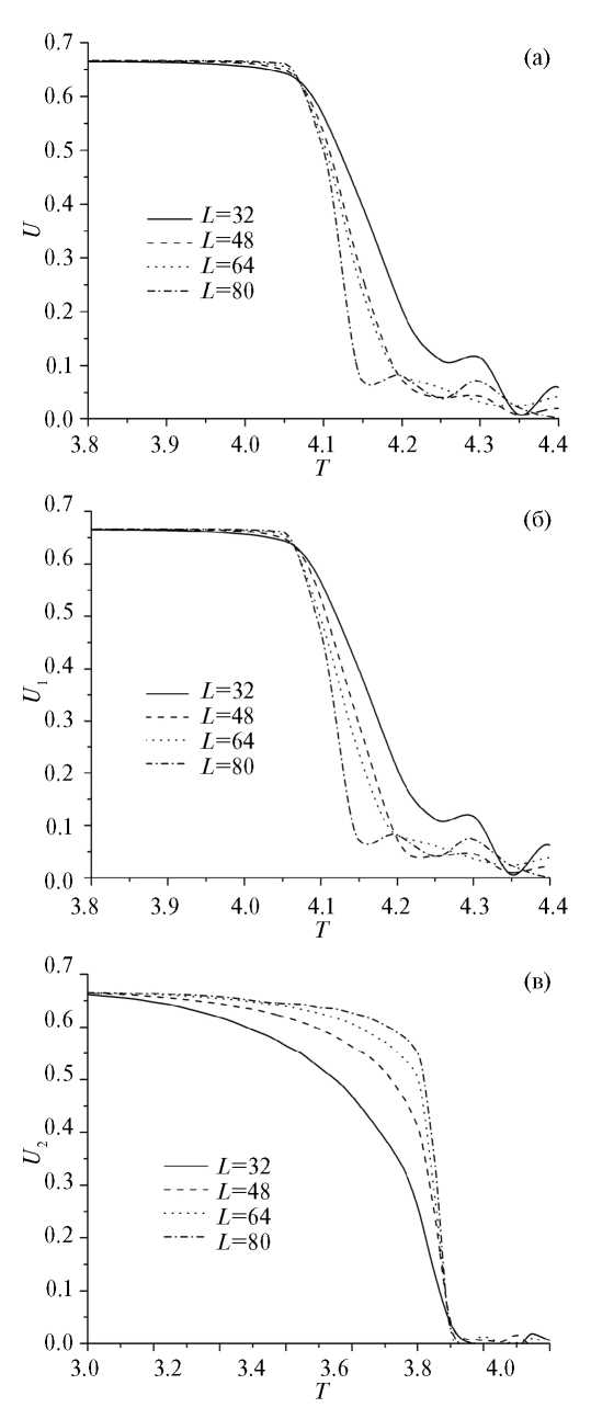 Рис. 2. Кумулянты Биндера для бислойной пленки с толщиной слоев D1=8, D2=6 и периодом решетки антиточек d=8: (a) для всей бислойной пленки; (б) для магнитотвердого слоя; (в) для магнитомягкого слоя.