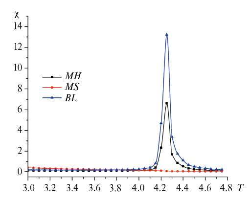 Рис. 4. Зависимость магнитной восприимчивости от температуры как для слоев пленки, так и для двухслойной пленки в целом. (MH — график восприимчивости для магнитотвердого слоя; MS — график восприимчивости для магнитомягкого слоя; BL — график восприимчивости для бислойной пленки.)
