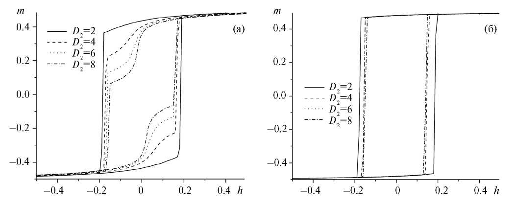 Рис. 5. Петли гистерезиса для пленок с различной толщиной магнитомягкого слоя D2 и отношением обменных интегралов R: (a) R=0.4; (б) R=0.8.