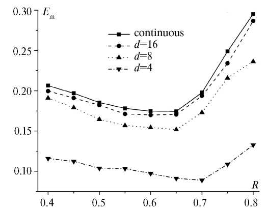 Рис. 9. Зависимость энергии перемагничивания Em от отношения обменных интегралов R при различной толщине магнитомягкой составляющей D2 для сплошной пленки и пленки с разными периодами решетки антиточек d: (a) сплошная пленка; (б) d=16; (в) d=8; (г) d=4.