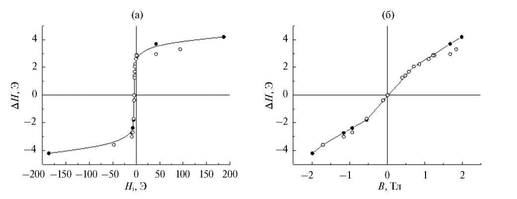 Рис. 2. Зависимости ΔН от Нi и В в отожженном образце стали 09Г2. Сплошные линии представляют собой результат их теоретического определения.