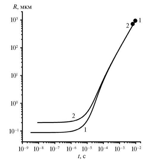 Проведено численное исследование динамики роста газовых пузырьков в расплавленном металле. Рассмотрено два варианта, представленных в таблице. Изменение радиуса газовых пузырьков при CTiH2 = 1.5 % и 0.5 % по массе иллюстрирует рис. 2.