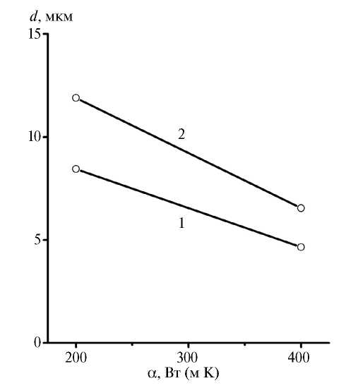 Рис. 7. Влияние интенсивности теплосъема a на размер первичного зерна в затвердевшем металле после модифицирования при CTiH2 = 1.5 мас.% (1) и CTiH2 = 0.5 мас.% (2). o — результаты расчетов.