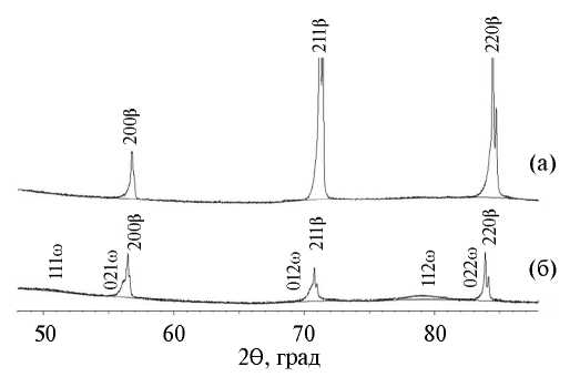 Рис. 1. Участки дифрактограмм сплавов VST3553 (а) и Ti–14Mo (б) после закалки.