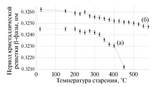 Рис. 5. Изменение периода кристаллической решетки βм-фазы в сплавах VST3553 (а) и Ti–14Mo (б) после закалки и старения при различных температурах.