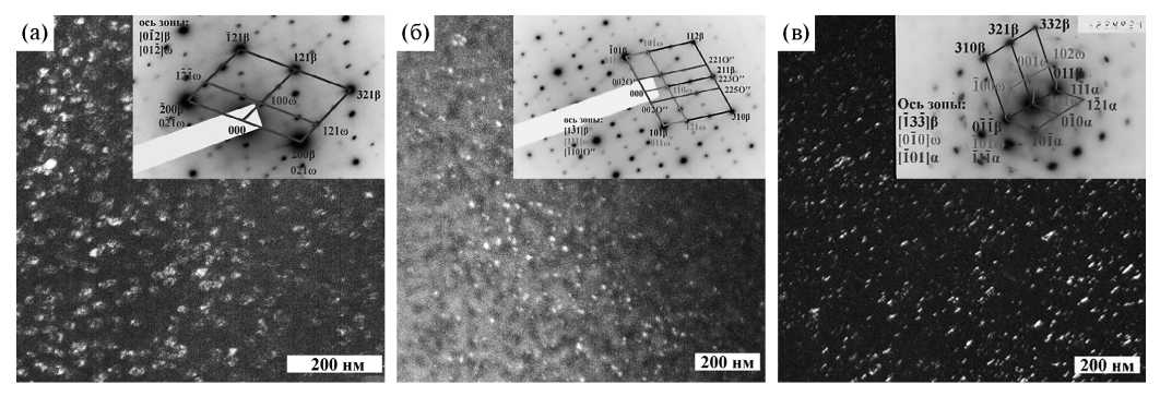 Морфологически ωизо-фаза после закалки и старения представлена дисперсными “усеивающими” тело β-матрицы частицами, средний размер которых в ходе старения при 350°С в течение 2 ч достигает ~ 15 нм (рис. 6а).