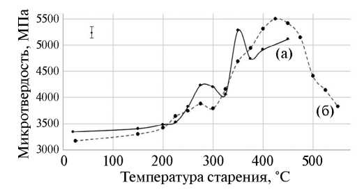 На начальных этапах роста частиц α-фазы их морфология близка к эллипсоидальной (со средними размерами большей полуоси 15 нм и меньшей полуоси 5 нм после старения при 350°С, рис. 6в), но при повышении температуры старения всего на 25°С морфология уже сменяется на пластинчатую (со средними размерами пластин: длина 600 нм и толщина 25 нм, превалирует двумерный рост частиц). Выделение дисперсных частиц α-фазы приводит к повышению уровня микротвердости в результате старения при 400…450°С на ~ 1600…1800 МПа, по сравнению с твердостью сплава в закаленном состоянии (рис. 7а). Поле старения при температурах свыше 450°С фиксируется двухфазная (α+β)-структура.
