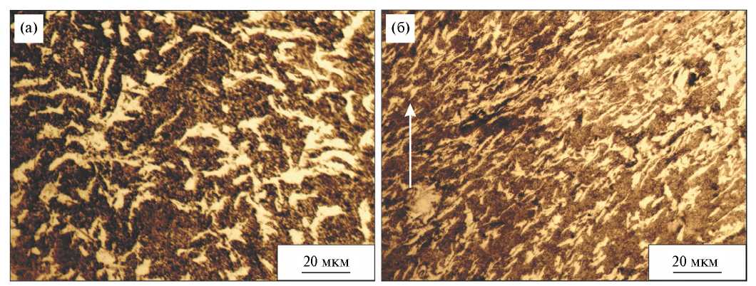 Рис. 2. Микроструктура сплава Al–6Ca–3Ce, сформировавшаяся в результате РКУП, в поперечном (а) и продольном (б) сечении образца (оптическая микроскопия). Стрелкой указано направление прессования.