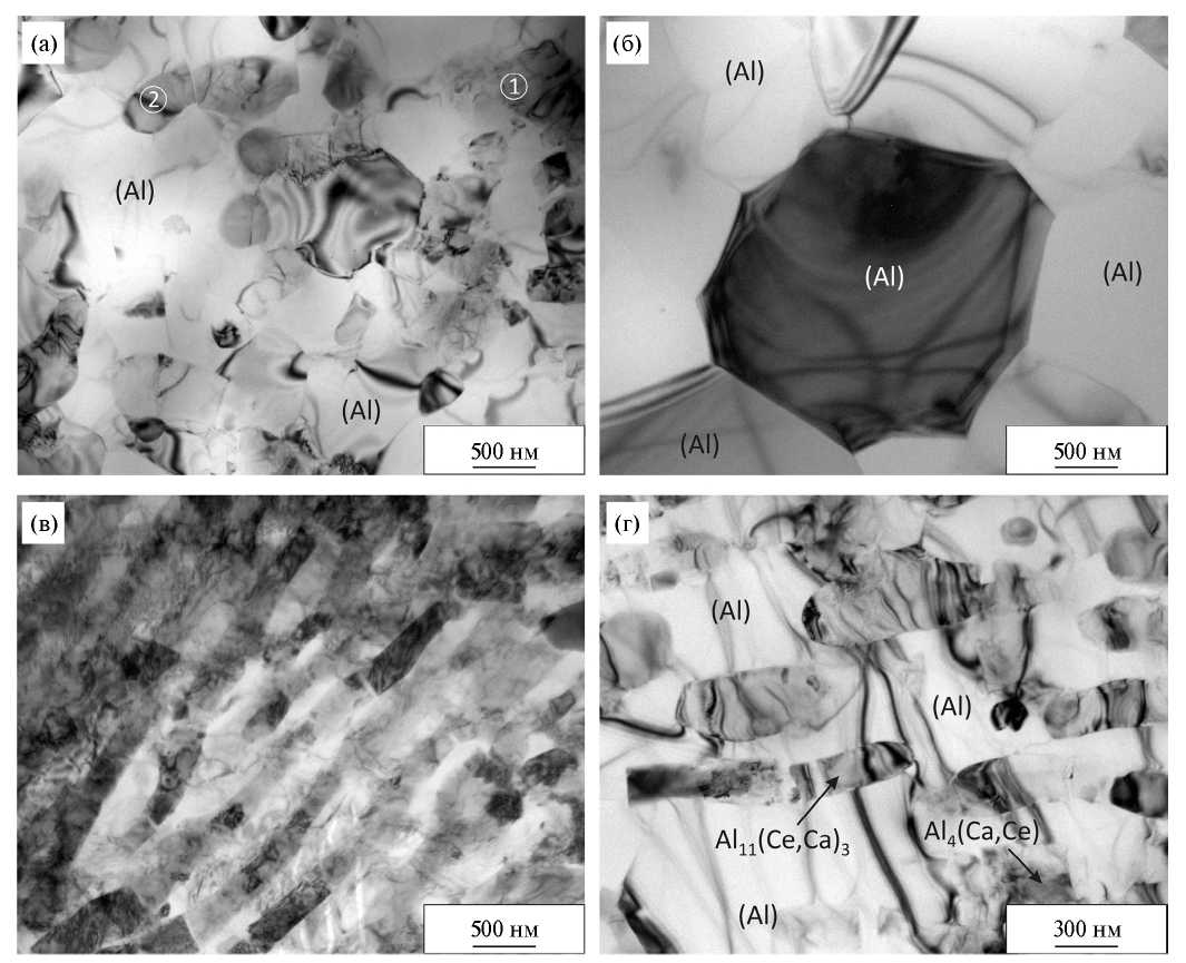 По данным просвечивающей электронной микроскопии в результате РКУП в сплаве сформировались структура, образованная как ультрамелкими субзерами с малоугловыми границами (рис. 3а), так и относительно крупными новыми зернами размером от 1 до 3 мкм (рис. 3б), при этом плотность внутризеренных дислокаций невысокая, о чем свидетельствует светлый контраст внутренней области кристаллитов. Частицы эвтектики дробятся сколом. По данным МРСА в структуре выявлены частицы системы Al–Ca–Ce двух типов: 1-й тип с атомной долей кальция и церия 16.9–21.5 % и 1.2–2.0 % и 2-й тип с атомной долей кальция и церия 10.5–16.0 % и 6.8–8.2 % соответственно (рис. 4). Частицы первого типа, по-видимому, являются измельченными эвтектическими частицами Al4(Ca,Ce), а второго типа — Al11(Ce,Ca)3 [1]. Отличие микроструктуры сплава в продольном сечении заключается в большей объемной доле эвтектических частиц вытянутой формы по сравнению со структурой в поперечном сечении (рис. 3в, г).