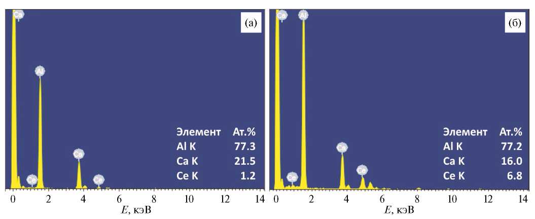 Рис. 4. Результаты МРСА-анализа сплава Al–6Ca–3Ce после РКУП: (а) спектр в области № 1 на рис. 3а; (б) спектр в области № 2 на рис. 3а.