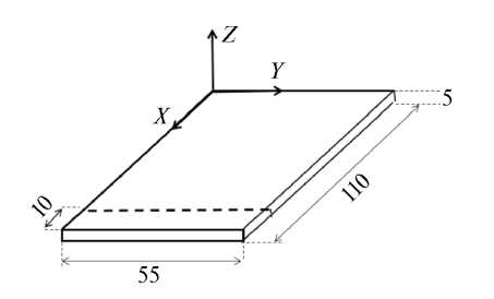 Приготовление образцов. Образцы были приготовлены в Иркутском национальном исследовательском техническом университете по технологии, описанной в [3]. Две пластины размерами 110×55 мм и толщиной 5 мм из стали 30ХГСА (рис. 2) были обработаны на дробеметной установке контактного типа УДФ-4 шариками из стали ШХ15 диаметром 3.5 мм. Химический состав стали 30ХГСА представлен в табл. 1 (ГОСТ 4543–2016).