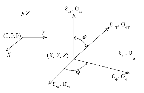 Рис. 4. Деформации и напряжения в точке измерения (x, y, z) в системе координат образца (X, Y, Z): εxx, εyy, εzz — деформации в направлениях X, Y, Z; σxx, σyy, σzz — напряжения в направлениях X, Y, Z; φ, ѱ — направляющие углы; εφψ — деформация в направлении, задаваемом углами φ, ѱ; σφψ — напряжение в направлении, задаваемом углами φ, ѱ; εφ — деформация в направлении, задаваемым углом φ при ѱ = 90°; σφ — напряжение в направлении, задаваемым углом φ при ѱ = 90°; (0, 0, 0) — начало координат координатной системы (X, Y, Z).