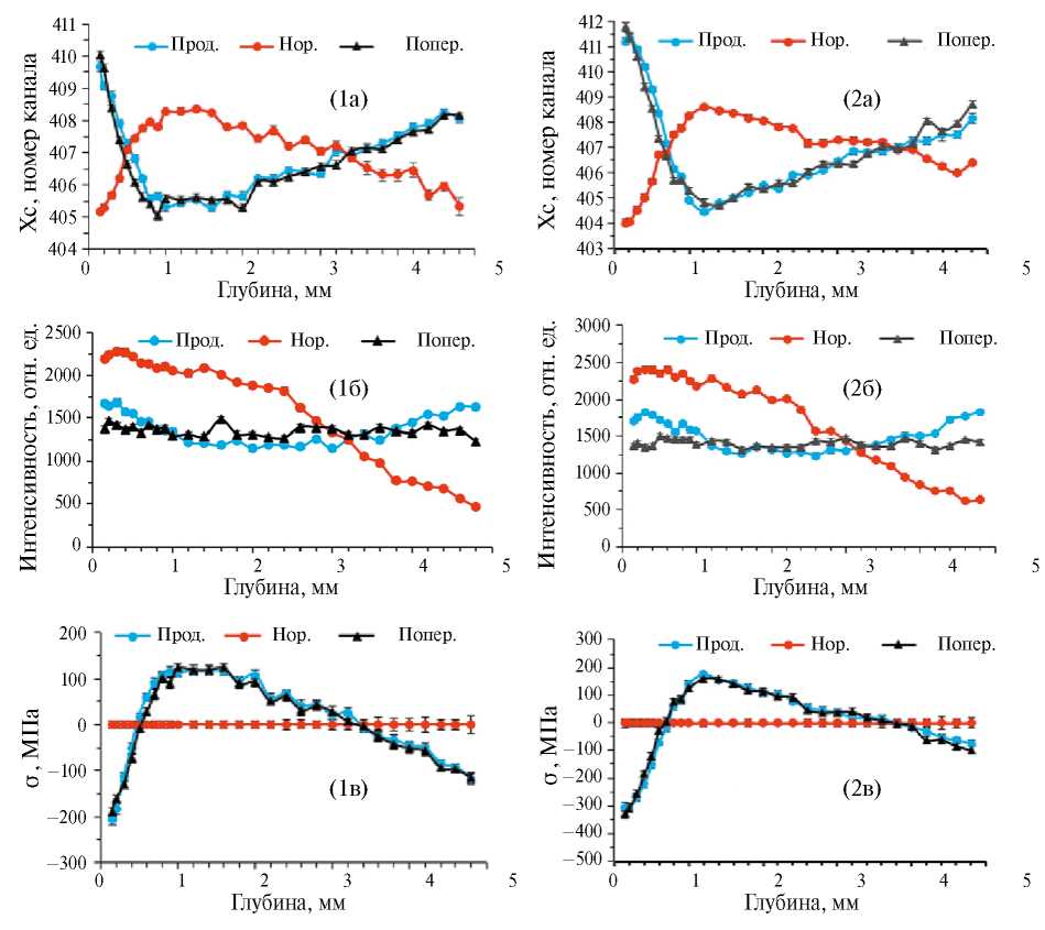 При измерении продольной и поперечной компонент деформации длина пути нейтронов в материале, и, следовательно, интенсивность дифракционного пика не зависят от глубины. Поэтому небольшое различие в интенсивности в средней части толщины и вблизи поверхностей пластин (рис. 5, 1б, 2б) свидетельствует о наличии небольшой текстуры. Поскольку изменение интенсивности наблюдается вблизи обработанной и необработанной поверхности, текстура не связана с обработкой и была в необработанной пластине.