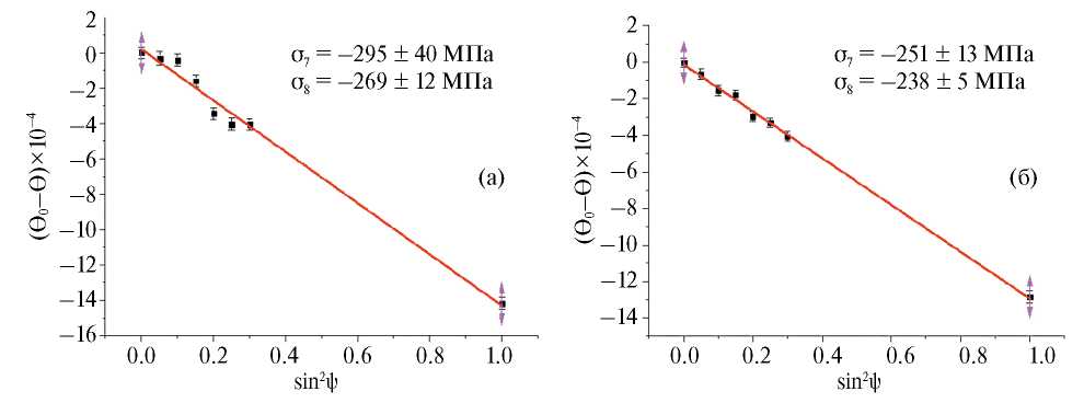 Значения θ0, полученные разными способами, были близки и отличались на величину, соответствующую изменению деформации менее ± 40 με (1 µε = 10−6). Однако использование одного и того же значения θ0 для всех измеренных точек (глобальное θ0) приводило к тому, что нормальная компонента напряжения увеличивалась при приближении к обработанной поверхности до –80 МПа на глубине 0.15 мм. Это противоречит тому, что нормальная компонента напряжения должна уменьшаться при приближении к поверхности до нуля на поверхности. Поэтому в каждой точке измерения использовалось значение θ0, полученное из условия равенства нулю нормальной компоненты напряжения в этой точке.