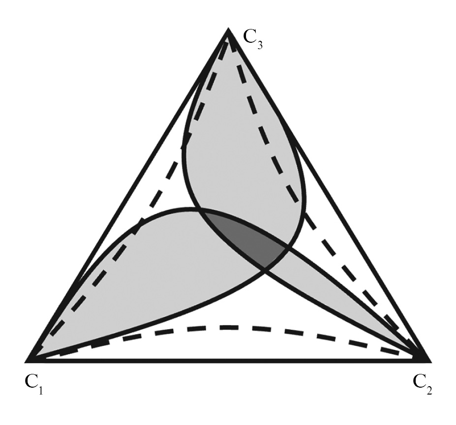 2. Fig. 1. Regions of spinodal instability in two components in the diagram of states of a triple alloy (schematic view). The dashed lines correspond to temperature T1 when the regions of spinodal decay do not overlap. The solid lines correspond to a lower temperature T2